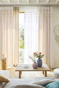 今あるカーテンの少し印象を変えることのできる「フロントレース」にするのはいかがでしょうか。フロントレースとはレースカーテンを室内側に取り付けるスタイルの事です。普段隠れているレースカーテンをフロントレースにする事によってドレープカーテンがマイルドになっていつもと違う雰囲気になります。