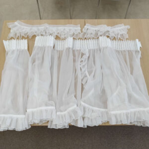 両サイドの生地が一枚づつと真ん中の大きい生地が一枚、共生地のフリルタッセルが計4本です。