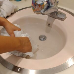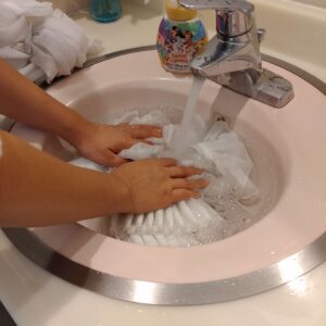 店内に洗濯機がないので洗面所で洗います。