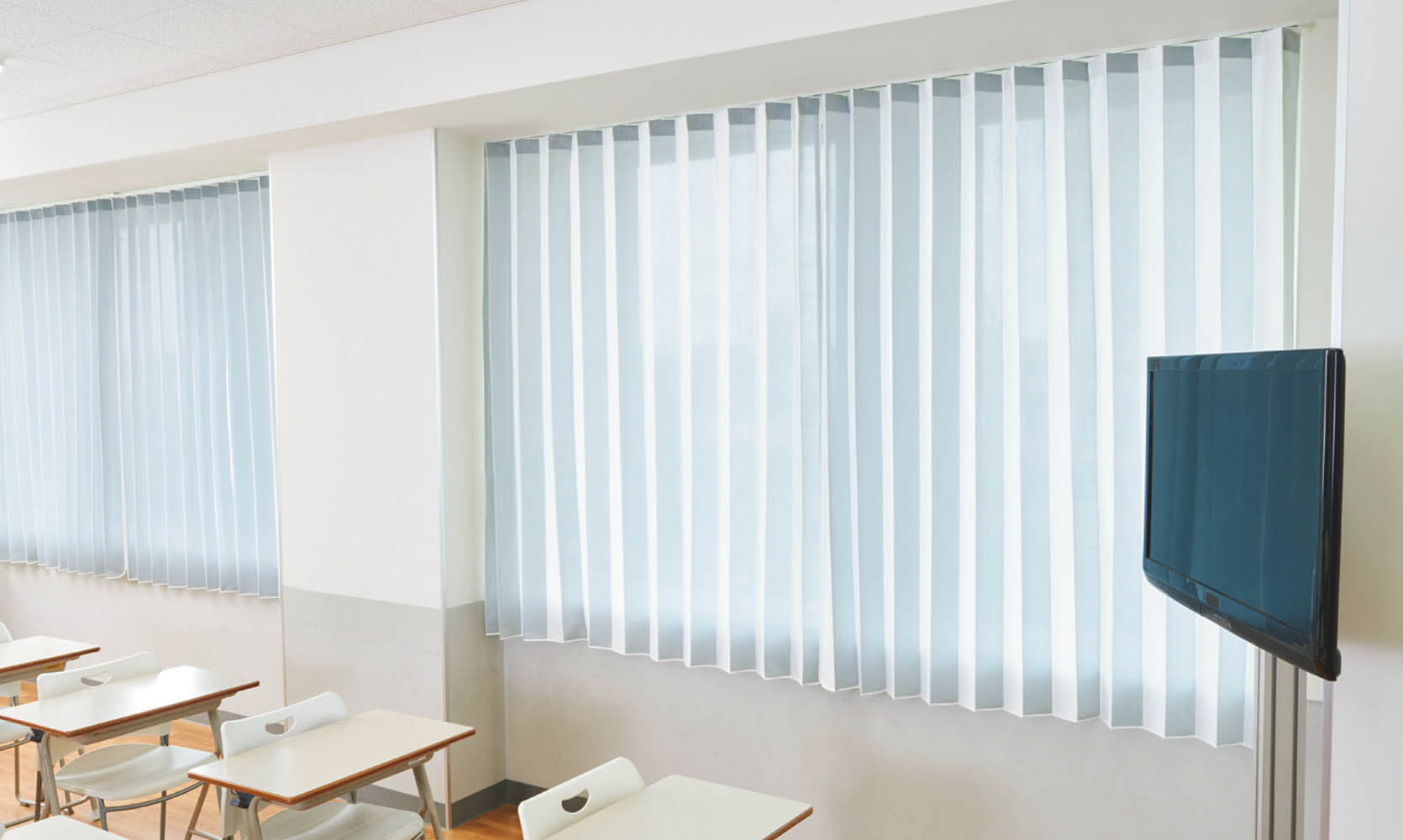 プリーツのような形状のパタパタカーテンに濃色面と淡色面を交互に配置することで、電子黒板のディスプレイの反射や映り込みによる眩しさを抑えながら、教室内の照度を快適に保つ新機能商品です。