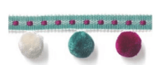 ポンポントリムは、小さな毛玉状の飾り、いわゆるポンポンが一定の間隔で連なったトリムです。ふわふわとした丸い形状が愛らしく、カーテンやクッション、ベッドリネンなどに取り付けることで、空間に遊び心と温かみをもたらします。